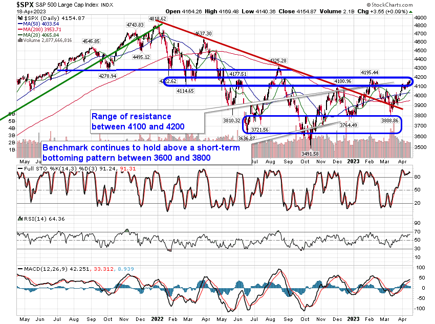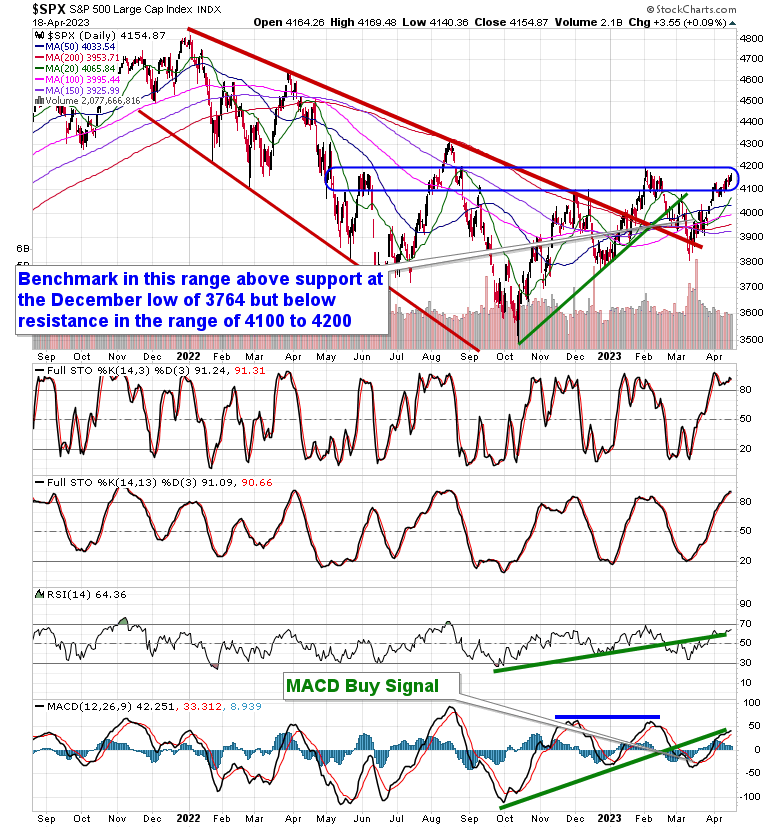 Stocks hovered close to the flat-line on Tuesday as investors wait for the onslaught of earnings reports in the days ahead. The S&P 500 Index closed higher by just less than a tenth of one percent, remaining within the range of resistance between 4100 and 4200. Momentum indicators continue to show signs of struggle as investors look for a catalyst to push prices one way or the other. Increasingly, we are starting to see major moving averages fan out in a positive manner, providing a confluence of support below the market that is able to catch prices should they fall, but we are still well off from realizing the overwhelming bullish trend that has been seen in past bull markets that allow traders to buy pretty much anything. For now, we are sticking with our Accumulate candidates within our weekly chart books and we remain prepared to flip to a more a more cautious/conservative portfolio if and when conditions permit.