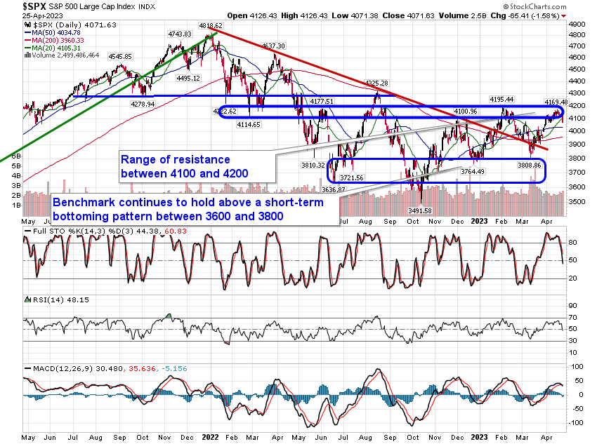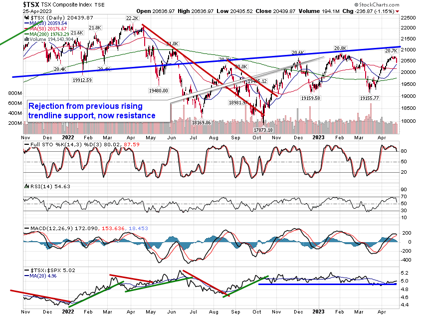 Stocks sold off on Tuesday as concerns in the banking industry re-emerged follow the release of the first quarter earnings results from beleaguered bank First Republic (FRC). The S&P 500 Index closed down by 1.58%, moving out of the range of overhead resistance between 4100 and 4200 and breaking below short-term support at the 20-day moving average. Following weeks of degradation in upside momentum, MACD has triggered a new sell signal as the technical indicator crosses below its signal line. The bearish cross occurs at a level lower than the sell signal that preceded it in February, continuing a path of lower-highs with respect to the momentum indicators that has been apparent since August of last year. It remains clear that the market lacks the “lift-off” capacity to break the range of resistance that it has been struggling with for many months and a retracement lower looks to be required in order to re-invigorate buying demand. As highlighted last week in our report to subscribers, the break below the ascending wedge pattern on the hourly chart of the benchmark projects a downside target towards the rising 200-hour moving average, a level that is now around 20-points below at 4050. The benchmark has become short-term oversold, but momentum indicators on this shorter-term view have yet to break their declining trend that they have been in throughout the month of April. Just a few more days remain in the best six months of the year trend for stocks and the MACD sell signal that has been revealed on the daily chart is pretty compelling to follow-through with the action that it suggests; historically, MACD sell signals triggered on the daily chart within the vicinity of the average peak to the best six months of the year trend for stocks at the start of May have typically provided ideal exit points to rotate away from risk (stocks) and towards safe-haven alternatives with a view to re-enter sometime later in the summer/early fall upon a peak in summer volatility.
