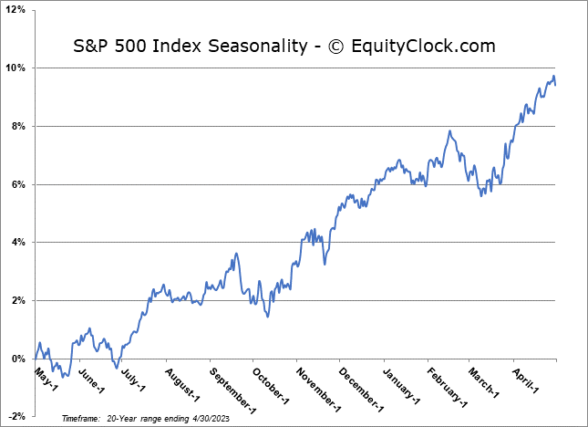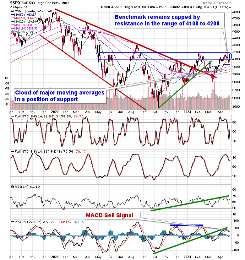 Stocks drifted higher to close out the week and the month as investors shook off concerns pertaining to a banking crisis and instead focused on earnings, which have predominantly come in better than expected. The S&P 500 Index closed with a gain of just over eight-tenths of one percent, closing, once again, in the range of overhead resistance between 4100 and 4200. The cloud of major moving averages between 3950 and 4050 remains in a position of support, helping to carry the benchmark through to the peak of its best six month of the year trend at the start of May. MACD remains on a sell signal that was triggered around the start of this week, but this hasn’t stopped portfolio managers from stepping in as they seek to pad their books as the month comes to a close.