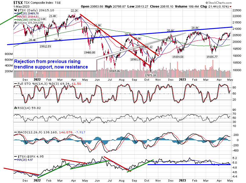 Stocks gyrated around the flat-line to start the new week and the new month as investors brace for the Fed policy announcement on Wednesday. The S&P 500 Index closed essentially unchanged, remaining within the range of resistance between 4100 and 4200. Support continues to be implied by the confluence of major moving averages in the range of 3950 to 4050. This span of support effectively marks the limits denoted by the 50 and 200-day moving averages, which are starting to converge on one another as the shorter-term average flat-lines while the longer-term average continues to rebound. Ultimately, the lack of a parallel rising path of these moving averages has yet to express a defined bullish backdrop, one where momentum is on your side to carry risk assets higher over a prolonged period. MACD remains on a sell signal that was triggered last week, ahead of the month-end rebound. Seasonally, stocks have tended to remain afloat through the first week of May, but we are at the end of the best six month trend for stocks, warranting a greater scrutiny of the technicals to provide the signal of whether to take down risk in portfolios as the market transitions into a period of risk-aversion.