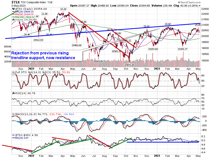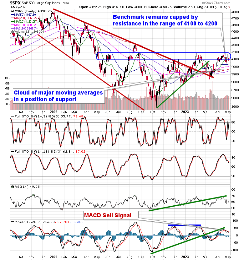 Stocks closed lower on Wednesday as investors digested comments from Fed Chair Jerome Powell following the two-day FOMC meeting.  The S&P 500 Index ended down by seven-tenths of one percent, continuing to show rejection from the range of resistance between 4100 and 4200 that has capped upside momentum for the better part of the past year.  Momentum indicators continue to roll over with MACD remaining on a sell signal that was triggered last week.  While support continues to be implied around the congestion of major moving averages between 3950 and 4050, the market and the economy are providing a more compelling argument to place a heavier weight on overhead resistance than the potential level of support below.  A break below the December low is still view as required to confirm a negative intermediate-term path, one that would see a return of that sustained negative trajectory that was observed through the first three-quarters of last year.  The rotation away from core-cyclical segments of the market and the adoption of safe-havens (gold and treasury bonds) already expresses a risk-averse market, one that has greater downside risks than upside potential, at least for now.