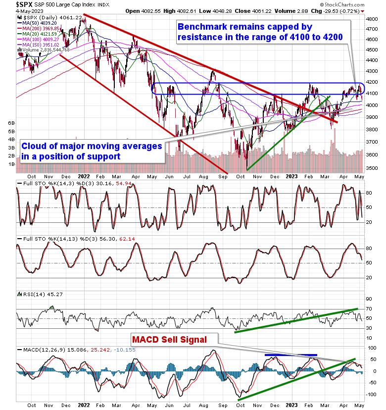 Ongoing concerns pertaining to a banking crisis continue to weigh on the broader market, sending stocks lower for a fourth straight session. The S&P 500 Index closed with a decline of just over seven-tenths of one percent, continuing to realize rejection from the range of resistance between 4100 and 4200. The barrier forms the basis of a double-top pattern, a setup that has downside implications of 400-points below the lower limit of the pattern and horizontal support at 3800. For now, the benchmark is maintaining support at the congestion of major moving averages in the range between 3950 to 4050, but confidence that it will be able to maintain this variable range is low given the significant barrier presented overhead and the ongoing degradation in momentum. We have reached the average peak to the best six month trend for stocks that started in October and equity market performance following this date is typically nothing to get excited about, nor something to be overly exposed to on the long side.