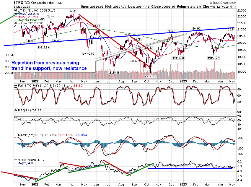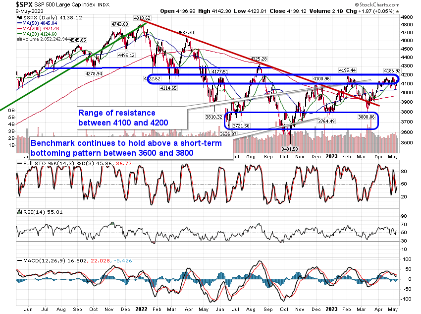 Stocks closed mixed on Monday as investors weigh the resiliency of the labor market with ongoing concerns pertaining to a banking crisis, uncertainty over the debt ceiling limit, and the onset of an economic recession. The S&P 500 Index edged higher by a mere five basis points (0.05%), closing, yet again, in the range of resistance between 4100 and 4200. Support at the congestion of major moving averages between 3950 and 4050 continues to keep this market afloat. Momentum indicators have rolled over from their peak charted in the middle of April, leaving the benchmark on a sell signal, according to MACD. During this period of risk-aversion for the broader equity market between May and October, investors typically need reason to send stocks definitively higher over a sustainable timeframe, but with many uncertainties plaguing the market, it is difficult to foresee the buying demand materialize to break the significant barrier overhead.