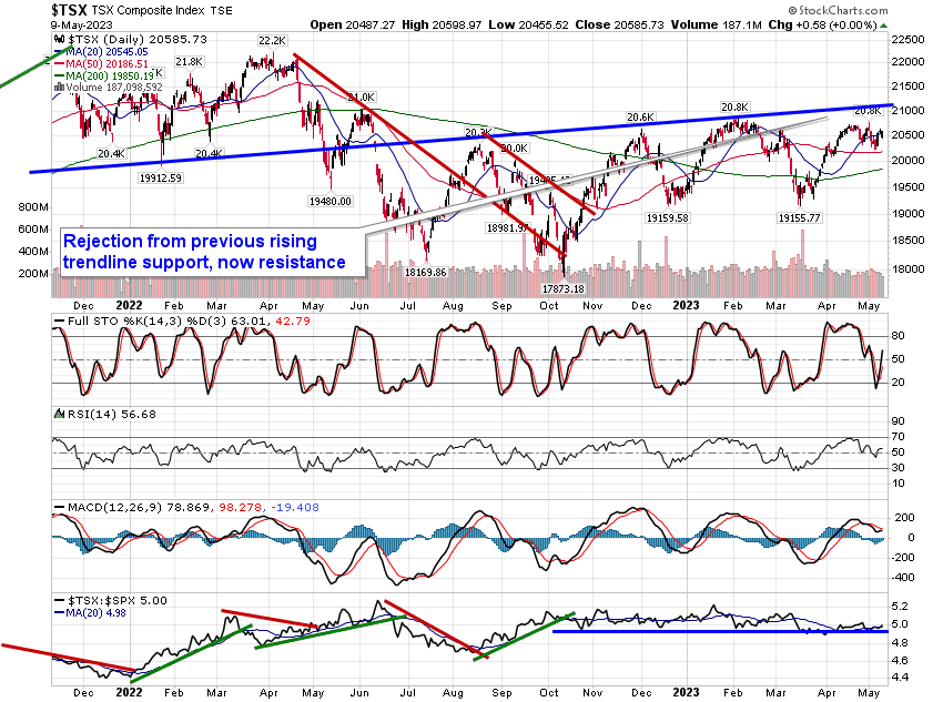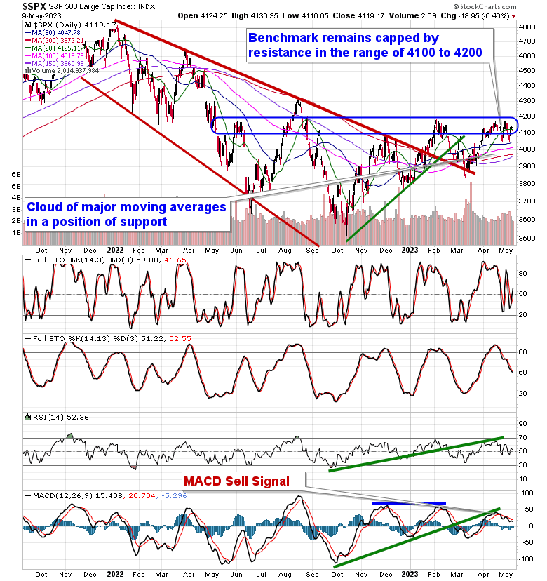 Stocks closed generally lower on Tuesday as investors wait for the outcome of debt ceiling negotiations in the US between Republicans and Democrats. The S&P 500 Index ended with a loss of just less than half of one percent, continuing to struggle in the range of resistance between 4100 and 4200. Support remains at the congestion of major moving averages between 3950 and 4050. It is becoming increasingly apparent that the market is in need of a catalyst to either breakout above the 100-point band of resistance or breakdown below the 100-point band of support; until this is seen, the grind continues. Momentum indicators continue to point lower and MACD remains on a sell signal, not providing anything particularly enticing to be aggressively bullish of stocks from a technical viewpoint.