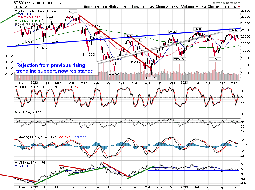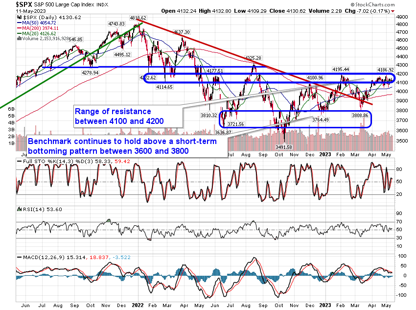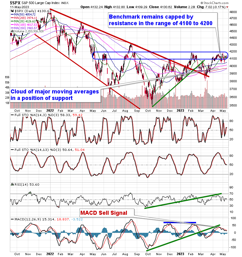 Stocks, on a broad scale, continue to do a whole lot of nothing as investors scrutinze incoming macro-fundamental data and the progression of debt ceiling talks, both of which risk sending the economy into recession if not corrected shortly. The S&P 500 Index ended with a loss of just less than two-tenths of one percent, once again remaining in this band of resisatnce between 4100 and 4200. Support continues to be viewed at the congestion of major moving averages between 3950 and 4050. Until a catalyst materializes to either fuel a breaout above resistance or a breakdown below support, this range will remain. Momentum indicators continue to pullback from their April peaks and the benchmark remains on a sell signal according to MACD.