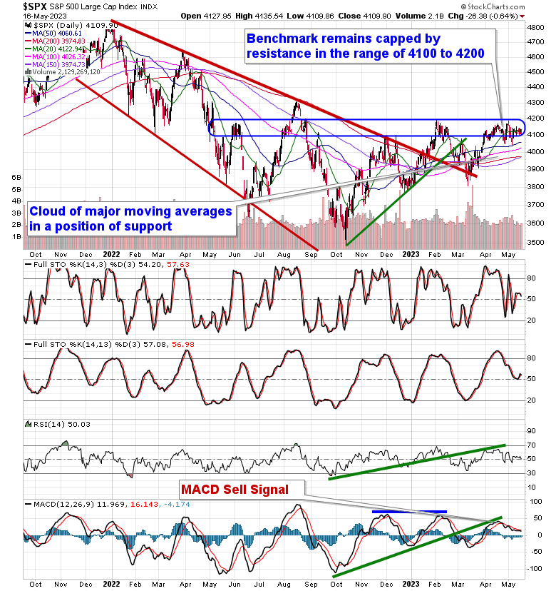 Stocks closed lower on Tuesday as investors monitor the ongoing negotiations on the debt ceiling limit. The S&P 500 Index ended down by nearly two-thirds of one percent, continuing to show struggle in the band of resistance between 4100 and 4200. Support is implied at the congestion of major moving averages in the range of 3950 to 4050. Momentum indicators are converging back on their middle lines in what has become a directionless market, waiting for a catalyst.