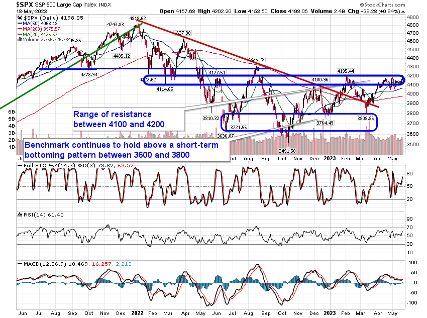 Stocks jumped for a second day as investors express their optimism that a debt deal between Republicans and Democrats will be reached in time to avoid default. The S&P 500 Index gained 0.94%, reaching up to the upper limit of the range of resistance that the benchmark has been struggling with for months between 4100 and 4200. Support remains implied around the congestion of major moving averages between 3950 and 4050. Momentum indicators have started to hook higher again with MACD triggering a new buy signal as it crosses back above its signal line. Instantly, the benchmark appears to be adopting a positive tilt, but while further strength is possible from here attributed to a debt ceiling deal and the positivity that surrounds the Memorial Day holiday week ahead, we still must question as to what will carry the baton beyond this short-term optimism to drive prices higher sustainably over the months ahead. A buy the rumour, sell the news scenario is suspected as economic fundamentals continue to erode.