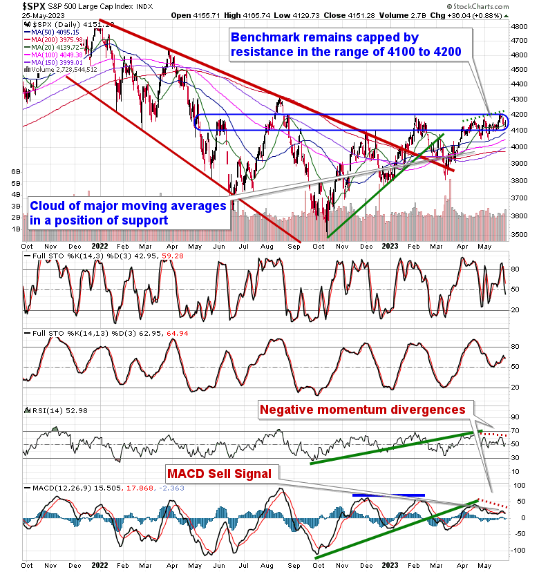 Stocks closed generally mixed on Thursday, but this did not stop the tech-heavy S&P 500 Index from producing a solid gain following blowout earnings from chip-maker Nvidia. The large-cap benchmark closed with a gain of just less than nine-tenths of one percent, remaining within the band of resistance between 4100 and 4200. Support remains implied around the congestion of major moving averages in the range of 3980 to 4080. A divergence between the direction of price and momentum can be seen over the past month where the benchmark is marginally higher than where its was through the middle of April, but MACD and RSI are lower, now hovering around the mid-points to their spans. The opposing directions is very much indicative of the grind that the market finds itself in, not showing much broad upside buying demand and hinting of the loss of traction as it battles with horizontal resistance that has persisted for many months. The market remains within this period of seasonal positivity during the days surrounding the Memorial Day holiday, following which weakness is normal through the month of June, a period known for end-of-quarter mean reversion.