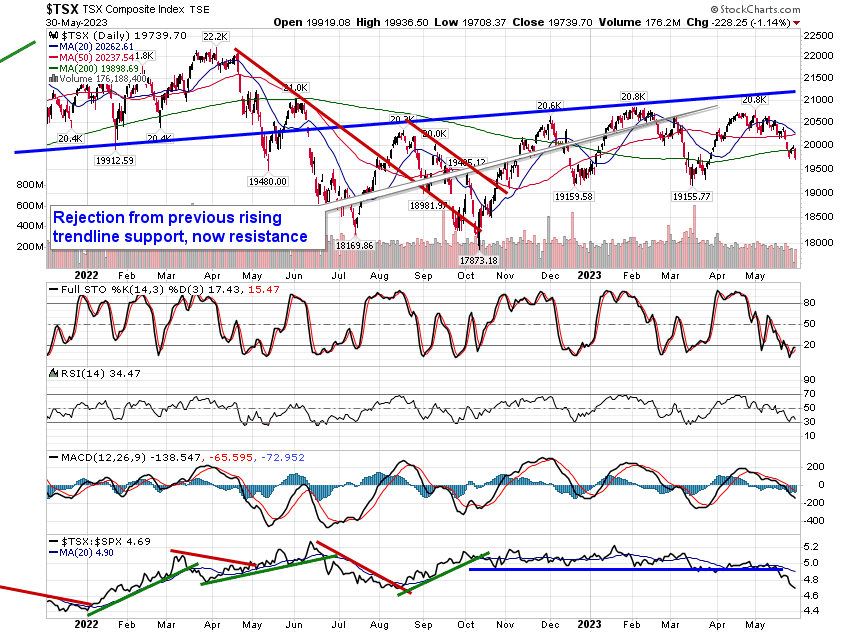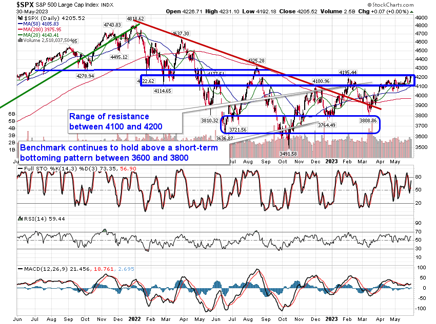 Stocks traded mixed following the Memorial Day holiday weekend as traders reacted to news that a tentative debt ceiling agreement had been reached. The S&P 500 Index closed unchanged (0.00%) on the day, but this didn’t stop further buying demand in growth/technology oriented sectors that have been excelling all year. The benchmark made further progress pushing marginally above resistance at 4200 as the benchmark attempts to escape from this sideways range that it has been stuck in for the past year. The negative divergence of momentum indicators over the past month has yet to confirm the apparent upward shift of prices. The benchmark remains supported at the congestion of rising moving averages, now between 4000 and 4100. As has been highlighted, seasonally stocks tend to remain supported in the days surrounding the Memorial day holiday, a tendency that runs into the new month of June, following which mean-reversion and general portfolio re-balancing is a dominant theme that tends to impose downward pressures on stocks until the start of the summer rally period at the end of June.