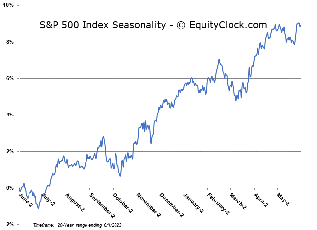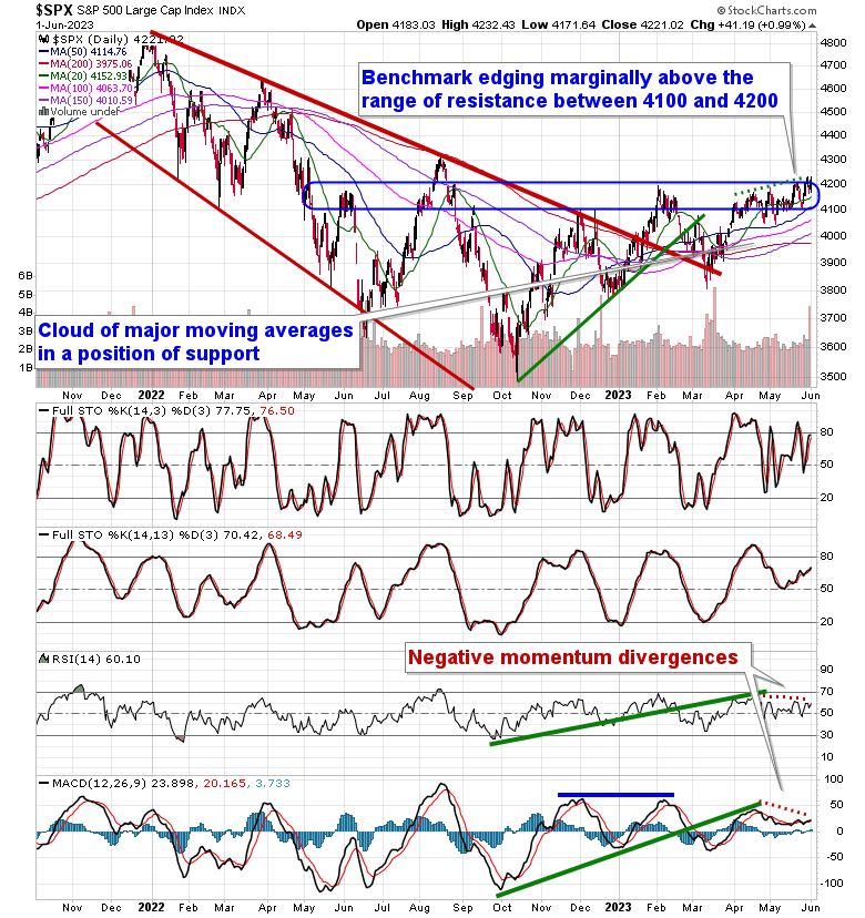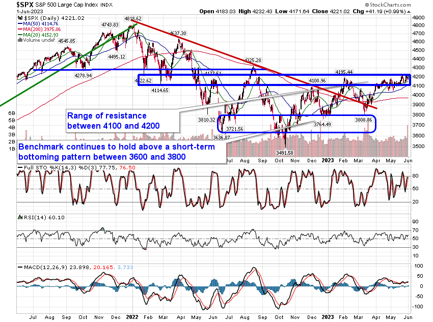 Stocks gained in the first session of June as monthly fund inflows injected a bid to equity markets. The S&P 500 Index gained just less than one percent, pushing, once again, marginally above resistance at 4200 and reaching towards the May 30th peak at 4231. Support remains persistent at the congestion of major moving averages, now between 4000 and 4100. Weak upside momentum remains apparent as the benchmark continues along with this grinding path that remains highly tenuous, driven solely by the growth/technology side of the market. Seasonally, beyond the first couple of days of June, tendencies turn gradually negative through the bulk of this last month of the quarter and the end of the first half of the year, giving us little to be enticed by from a broad market perspective until we get into the traditional summer rally period at the end of June.