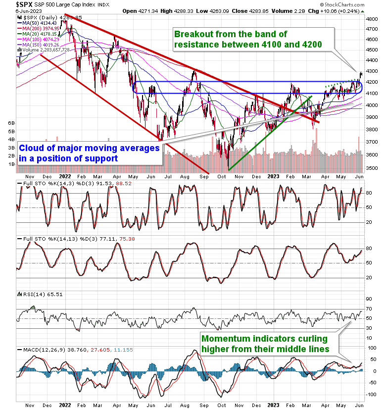 Stocks closed marginally higher on Tuesday as the rally in stocks starts to broaden out amidst the mean reversion that we have been expecting for the month of June. The S&P 500 Index closed with a gain of just less than a quarter of one percent, remaining above the band of resistance that was broken last week between 4100 and 4200. Major moving averages are maintaining an upward slope, providing support to the rising trend between 4000 and 4100. The benchmark is approaching an important Fibonacci level of last year’s pullback around 4300, which represents a 61.8% retracement of the over 1300-point decline that was realized between January and October of 2022. The hurdle closely aligns with the last major high charted in August of last year, presenting the next formidable hurdle for traders to contend with. So far reaction remains muted, but, in this mean reversion month of June, some kind of digestion around this hurdle appears probable.