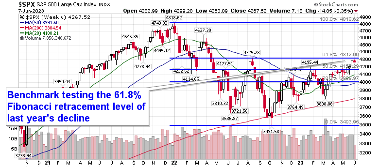 Stocks were generally mixed on Wednesday as the pendulum shifts away from some of this year’s winners (growth/technology) and towards many of the laggards. The growth heavy S&P 500 Index closed with a loss of nearly four-tenths of one percent, showing ongoing pause at the 61.8% Fibonacci retracement zone of last year’s decline at 4300. The benchmark is maintaining levels above the recently broken band of resistance between 4100 and 4200 and support at the congestion of major moving averages between 4000 and 4100 remains pointed higher below. The positivity surrounding the Memorial Day holiday, leading into the start of June, is now past and the mean-reversion phase that we had been forecasting is now firmly entrenched, a phenomenon that typically progresses through to the last few days of the second quarter at the end of this month.
