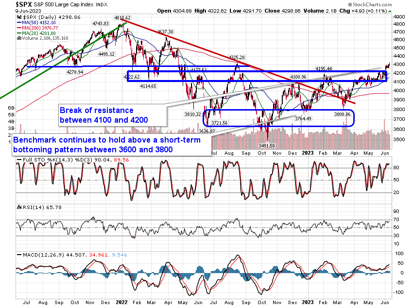 Stocks closed generally mixed on Friday as the aggressive mean reversion move that was realized earlier in the week levels off. The S&P 500 Index closed with a gain of just over a tenth of one percent, charting a rather indecisive daily doji candlestick around the psychologically important 4300 level, also the 61.8% Fibonacci retracement zone of last year’s market decline. The benchmark remains firm above previous resistance at the band between 4100 and 4200 that capped upside momentum over the past year and has yet to show any significant threat toward rising support at the congestion of major moving averages between 4000 and 4100. Momentum indicators continue to show characteristics of a bullish trend above their middle lines, but the lack of the aggressive short-term buying pressures that fuels a swift overbought condition just emphasizes the lack of excitement that traders are expressing towards enacting new positions amidst an uncertain economic backdrop. The bears are certainly in hiding following the recent breakout of the benchmark in recent weeks, but the bulls have their work cut out for them to rally the troops to push the benchmark sustainably higher, particularly during this notorious mean reverting month.