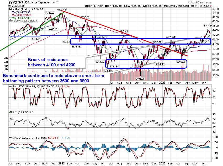 Stocks closed lower on Monday, led by many of the growth names that have flourished so far this year, as portfolio managers continue to rebalance their books back to investment policy guidelines ahead of the end of the quarter. The S&P 500 Index closed down by just less than half of one percent, pulling back towards short-term support at the 20-day moving average of 4312. Major moving averages continue to fan out, providing a number of points to shoot off of should a further correction ensue. Momentum indicators have alleviated overbought readings and MACD has now triggered a sell signal following the crossover below its signal line. Still, despite the sell signals that have been generated by both RSI and MACD in recent days, both are retaining characteristics of a bullish trend above their middle lines, which is a distinct shift from the bearish characteristics that were persistent through the first half of last year. Seasonally, the average start to the summer rally period begins as of the close of today (June 27th) and looking to increase risk (equity) exposure for this timeframe that typically runs through the middle of July can typically add alpha to portfolios.