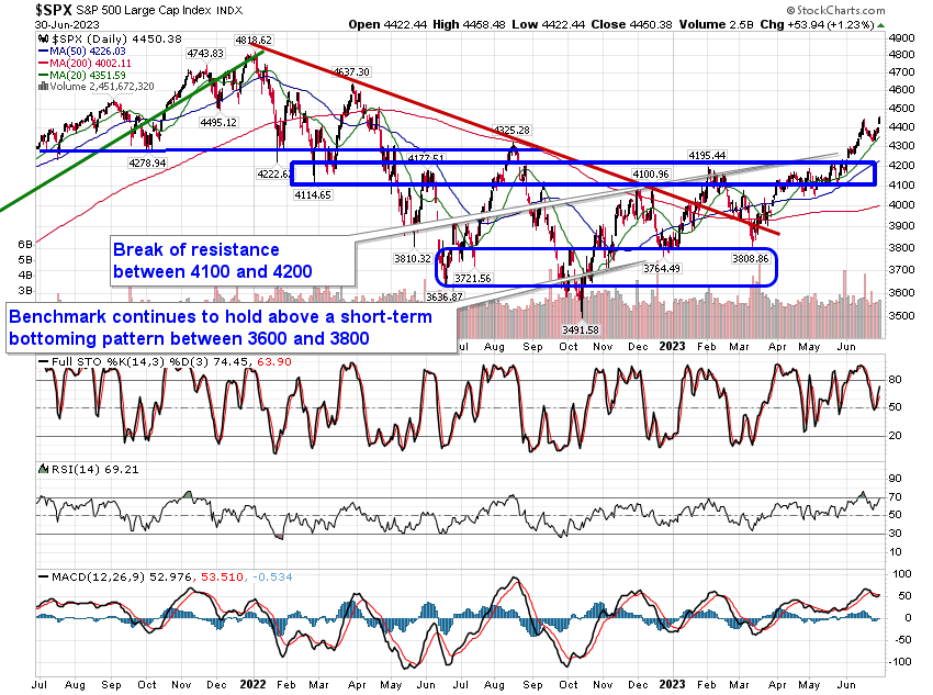 Stocks closed strongly higher on Friday as the normal summer rally stretches its legs given the chase for performance/window-dressing into quarter-end and the investment of new funds in the market at the start of the new quarter in July. The S&P 500 Index rallied by 1.23%, charting a fresh 52-week high and continuing to bounce from the 20-day moving average that now sits at 4351. Momentum indicators have curled back higher and RSI is once again knocking on the doorstep of overbought territory at 70. Characteristics of a bullish trend have become well ingrained, supportive of the normal rise in prices that we see of this mid-year period. In our monthly report for July released to subscribers, we make the contention that the large-cap benchmark has the momentum to reach 4,600 as part of this upside thrust, a target based on the calculated move of the breakout from the 400-point span between 3800 and 4200. Following that point and heading into the most volatile time of the year spanning the remainder of the third quarter, the need for renewed caution will exist.