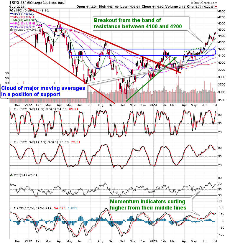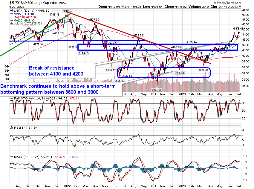 Stocks closed mixed on Wednesday as core-cyclicals struggled following a weaker than expected headline print of factory orders for May. The S&P 500 Index closed down by a mere two-tenths of one percent, continuing to hold above Friday’s upside open gap around 4400 and support at the rising 20-week moving average. Major moving averages continue to fan out, providing characteristic of a bullish trend and highlighting a number of points of reference below that may act as support should near-term volatility materialize. Momentum indicators are showing similar bullish traits above their middle lines. The only knock against the market, technically, at this point is that evidence of a short-term parabolic rise persists, which could make the benchmark vulnerable to a retracement towards major moving averages below, but seasonal tendencies through the middle of July suggest that stocks should remain resilient and the higher risk of decline is likely to be seen as the period of volatility in stocks ramps up in August and September. The breakout of the approximately 400-point span between 3800 and 4200 projects an upside target towards 4600, or just over 3% above present levels. The fundamental backdrop to the economy still presents plenty of reason for concern, but there are still areas to target within portfolios that check the three prong to our apporach. Our list of Accumulate candidates, according to our weekly chart books, is available to subscribers below.