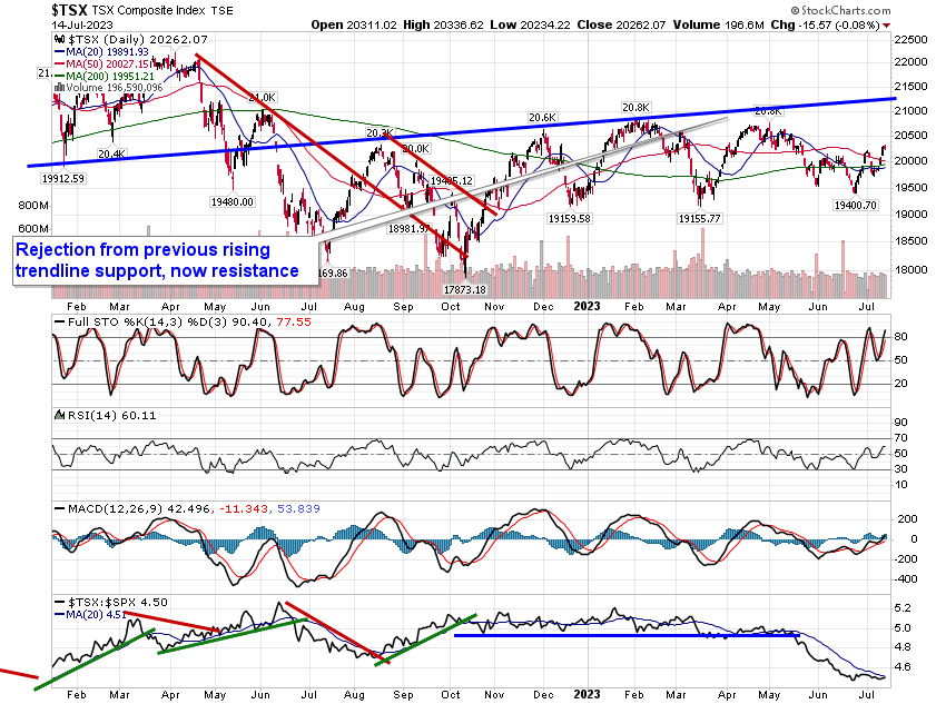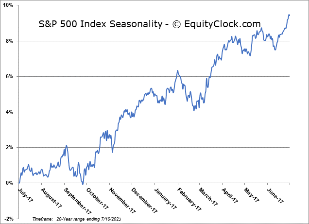 Stocks closed marginally lower on Friday as early hints that the summer rally period may be starting to lose steam emerges as we approach the average peak on the 17th of July. The S&P 500 Index closed down by one-tenth of one percent, realizing a reversal session as early day strength had traders booking profits. Support remains firm at the rising 20-day moving average, now at 4415, and the fanning out of major moving averages continues to present a bullish viewpoint from an intermediate-term perspective given the number of levels of support that are presented below. The Relative Strength Index (RSI) continues to border on overbought territory. While this stretched state could exhaust buying demand in the short-term, the overbought condition is yet another trait of a market that is within a bullish trend. The struggling state of the macro-economic fundamentals leaves us less inclined to chase overbought extremes and, rather, wait for pullbacks towards levels of support in order to pursue seasonal and technical trades as part of the summer rally and other third quarter buying patterns. Seasonally, strength in the broader market can persist throughout the entire month of July, but the strongest of the mid-year rally reaches a peak on the July 17th, on average. Investors must be prepared to book profits in seasonal summer rally trades through the remainder of the month given the elevated probability of a pullback through August and September, as per seasonal norms.