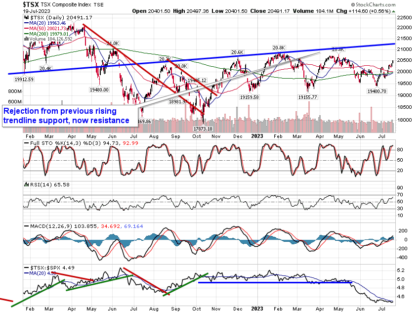Stocks continued to climb on Wednesday with the S&P 500 Index getting within arm’s reach of our proposed summer rally target of 4600. The large-cap benchmark closed with a gain of just less than a quarter of one percent, remaining supported by its rising 20-day moving average at 4435. The benchmark remains overbought according to the Relative Strength Index (RSI), but, aside from a hint of near-term buying exhaustion provided by Wednesday’s price action, signs of a peak have yet to be seen. Momentum indicators continue to show characteristics of a bullish trend above their middle lines, although an ongoing divergence of the direction of MACD versus the recent direction of price suggests that buying demand is starting to wane. This summer rally period that began in the last week of June has certainly been impressive, thus far, and we still must prepare for the next phase in the market, which is volatility through August and September.