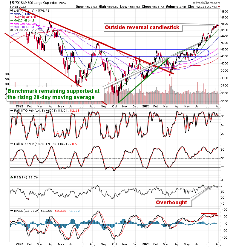 Stocks pulled back slightly on Tuesday as rates and the dollar jumped amidst investor optimism pertaining to the strength of economic data.  The S&P 500 Index slipped by just over a quarter of one percent, continuing to hold within the range of the bearish engulfing candlestick that was charted last week around resistance at 4600.  Ongoing degradation in market momentum can be seen as MACD diverges from the direction of price amidst a renewed sell signal with respect to this technical indicator that was triggered in recent days.  Support for the large-cap benchmark remains firm around the rising 20-day moving average, however, levels all the way back to the horizontal breakout point at 4200 are fair game as part of a near-term pullback coinciding with the period of normal volatility in the market during August and September.  While the trajectory of the benchmark remains positive and we do not expect this to change on any near-term correction, the risk-reward to holding elevated equity exposure at present levels is not ideal, but using any weakness through the months ahead to buy remains prudent.