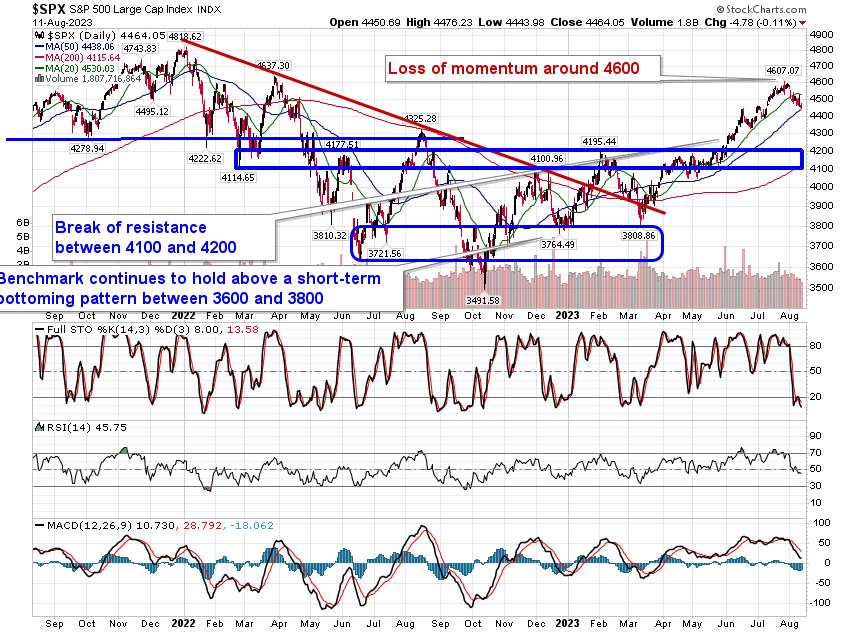 Stocks closed around the flat-line for a second day on Friday as ongoing weakness in the formerly beloved technology sector was offset by continued strength in energy and core-defensives (staples, health care, utilities, and REITs). The S&P 500 Index closed with a loss of just over a tenth of one percent, finding support around the 50-day moving average that was tested around the lows of the session. Resistance has been defined at the now declining 20-day moving average, providing a hurdle to shoot sell orders off of as part of this normal period of volatility/weakness that spans the months of August and September. Remember, levels down to the June breakout point at 4200 are fair game as part of this period of seasonal weakness, allowing the positive intermediate path to remain intact and potentially providing another buying opportunity for the best six months of the year for stocks that starts in October.