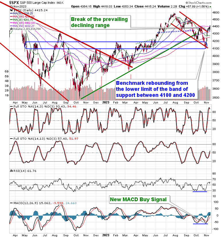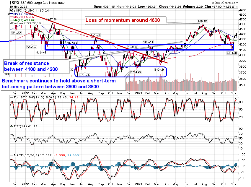 Stocks rallied to close the week amidst a poor read of consumer sentiment that put investors back on recession watch, leading to stability in the cost of borrowing. The S&P 500 Index gained 1.56%, moving above the 4400 horizontal level of resistance that had capped upside momentum through much of the past week. The benchmark is starting to clear the cloud of major moving averages that spans between 4250 (the 200-day) and 4400 (the 100-day), attempting to put the weakness that played out through the average period of volatility for stocks during the third quarter in the rear-view mirror. Near-term momentum is still showing signs of waning and there is still reason to expect some digestion/weakness to play out in the week ahead before we get into the positivity that surrounds the US Thanksgiving holiday. Overall, there is nothing actionable on the intermediate-term scale to suggest flipping from our Accumulate rating that we have maintained of the large-cap benchmark for the past few weeks in our weekly chart books.