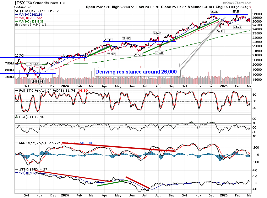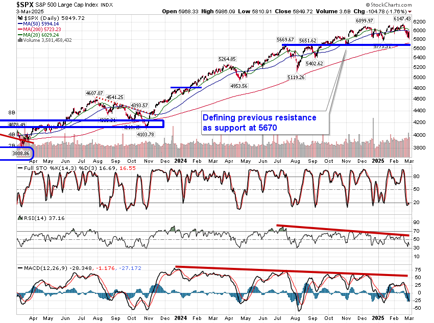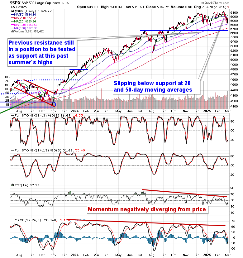 Tariff concerns continued to overhang markets on Monday, resulting in the largest single session decline for the S&P 500 Index since December. The large-cap benchmark fell by 1.76%, showing renewed rejection from resistance at the 50-day moving average (5994). The lower limit of the short-term trading range between 5830 and 6100 is being pressured, a break of which would see an easy runway back to highs charted last July and August around 5700. Momentum indicators on the daily chart have negatively diverged from price since the middle of last year, highlighting the waning enthusiasm investors had been expressing towards tech-heavy (Mag-7) benchmarks, like this, amidst extreme valuations. For now, the drawdown in the market can still be viewed as healthy and ordinary within a bull market, by any measure, but some critical levels below will warrant scrutiny, such as 5700 on the S&P 500 and 73,000 for Bitcoin. Below these thresholds, more dire scenarios for risk assets must be considered. We continue to monitor the potential impact of the apparent rotation in the market on our list of candidates in the market to Accumulate and to Avoid and we have adopted more of a neutral stance as segments that were previously noted as Accumulate candidates fall off (eg. Technology) and as areas to Avoid are added.