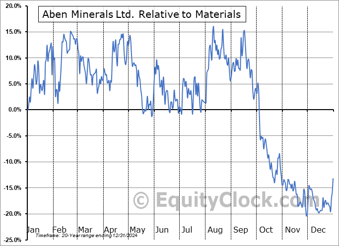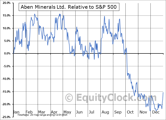Analysis of the Aben Minerals Ltd. (TSXV:ABM.V) seasonal charts above shows that a Buy Date of December 18 and a Sell Date of April 15 has resulted in a geometric average return of 12.34% above the benchmark rate of the S&P 500 Total Return Index over the past 20 years. This seasonal timeframe has shown positive results compared to the benchmark in 14 of those periods. This is a good rate of success and the return strongly outperforms the relative buy-and-hold performance of the stock over the past 20 years by an average of 49.24% per year.