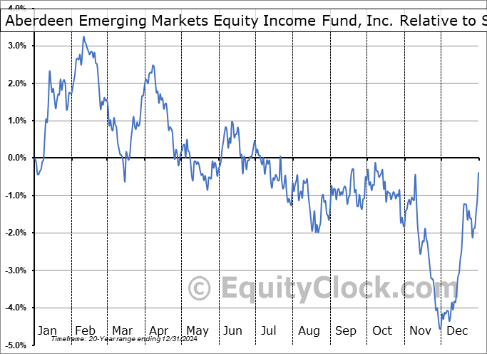 Analysis of the Aberdeen Emerging Markets Equity Income Fund, Inc. (AMEX:AEF) seasonal charts above shows that a Buy Date of November 29 and a Sell Date of February 18 has resulted in a geometric average return of 4.66% above the benchmark rate of the S&P 500 Total Return Index over the past 20 years. This seasonal timeframe has shown positive results compared to the benchmark in 15 of those periods. This is a good rate of success and the return strongly outperforms the relative buy-and-hold performance of the stock over the past 20 years by an average of 10.75% per year.