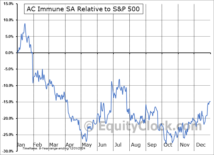 Analysis of the AC Immune SA (NASD:ACIU) seasonal charts above shows that a Buy Date of April 28 and a Sell Date of July 17 has resulted in a geometric average return of 12.47% above the benchmark rate of the S&P 500 Total Return Index over the past 8 years. This seasonal timeframe has shown positive results compared to the benchmark in 7 of those periods. This is a very good rate of success and the return strongly outperforms the relative buy-and-hold performance of the stock over the past 8 years by an average of 40.76% per year.