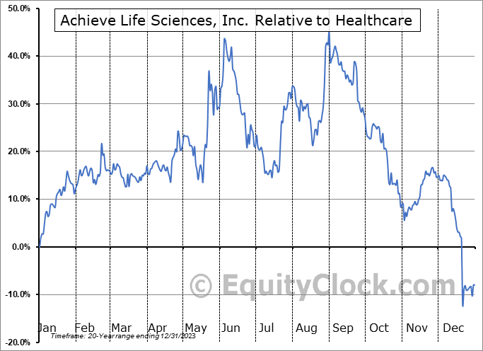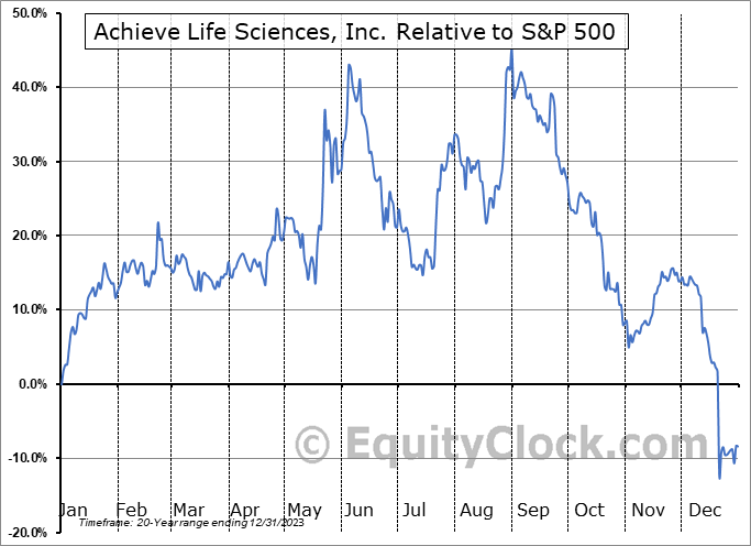 Analysis of the Achieve Life Sciences, Inc. (NASD:ACHV) seasonal charts above shows that a Buy Date of December 2 and a Sell Date of March 7 has resulted in a geometric average return of 6.85% above the benchmark rate of the S&P 500 Total Return Index over the past 20 years. This seasonal timeframe has shown positive results compared to the benchmark in 13 of those periods. This is a good rate of success and the return strongly outperforms the relative buy-and-hold performance of the stock over the past 20 years by an average of 106.85% per year.