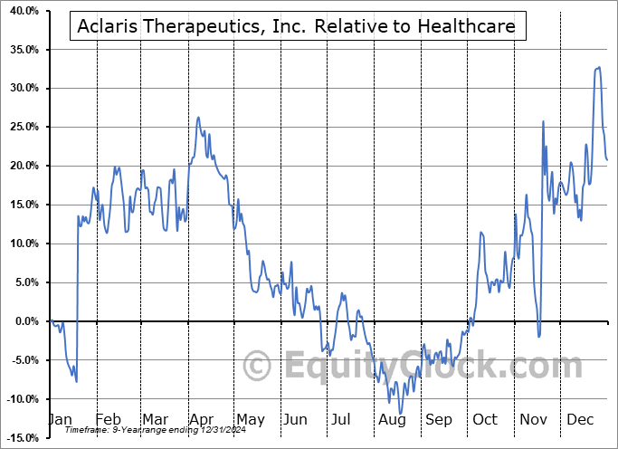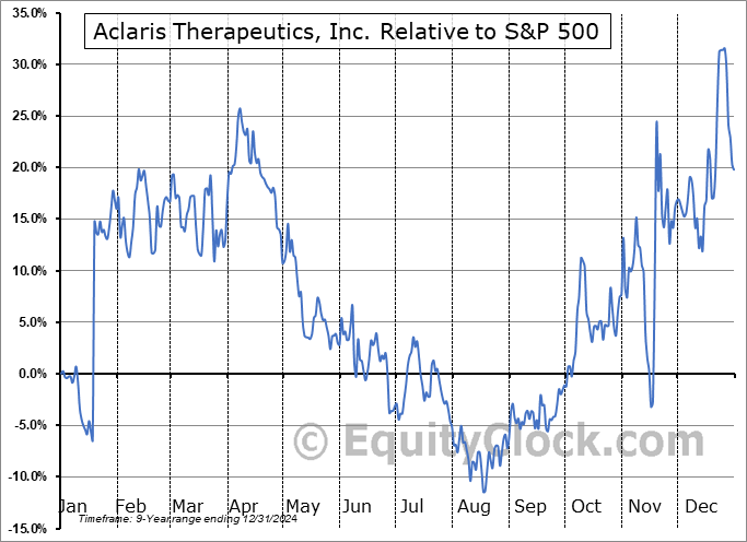 Analysis of the Aclaris Therapeutics, Inc. (NASD:ACRS) seasonal charts above shows that a Buy Date of August 10 and a Sell Date of November 2 has resulted in a geometric average return of 14.58% above the benchmark rate of the S&P 500 Total Return Index over the past 9 years. This seasonal timeframe has shown positive results compared to the benchmark in 7 of those periods. This is a good rate of success and the return strongly outperforms the relative buy-and-hold performance of the stock over the past 9 years by an average of 47.47% per year.