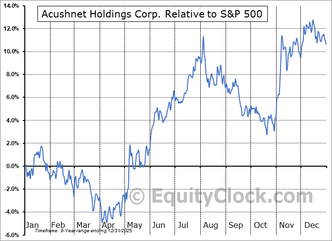 Analysis of the Acushnet Holdings Corp. (NYSE:GOLF) seasonal charts above shows that a Buy Date of April 9 and a Sell Date of August 4 has resulted in a geometric average return of 12.98% above the benchmark rate of the S&P 500 Total Return Index over the past 8 years. This seasonal timeframe has shown positive results compared to the benchmark in 8 of those periods. This is an excellent rate of success and the return strongly outperforms the relative buy-and-hold performance of the stock over the past 8 years by an average of 8.5% per year.