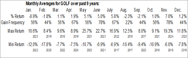 A word of caution: Only 8 years of data is available for shares of GOLF, perhaps insufficient to create a seasonal profile that accurately gauges the seasonal tendencies influencing the investment. Ideally, while 20 years is preferred, at least 10 years of data is required to perform a seasonal analysis that is considered to be reliable for future seasonal periods.