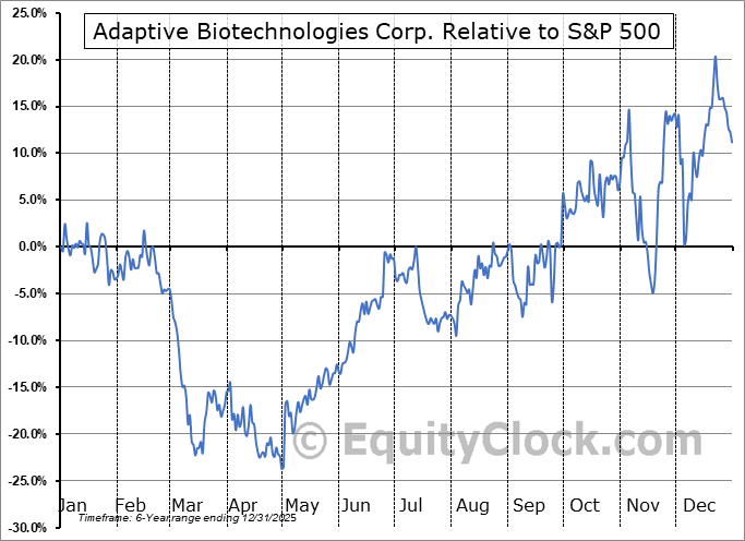 Analysis of the Adaptive Biotechnologies Corp. (NASD:ADPT) seasonal charts above shows that a Buy Date of April 30 and a Sell Date of July 26 has resulted in a geometric average return of 12.14% above the benchmark rate of the S&P 500 Total Return Index over the past 6 years. This seasonal timeframe has shown positive results compared to the benchmark in 5 of those periods. This is a very good rate of success and the return strongly outperforms the relative buy-and-hold performance of the stock over the past 6 years by an average of 33.52% per year.
