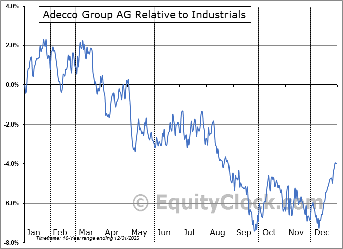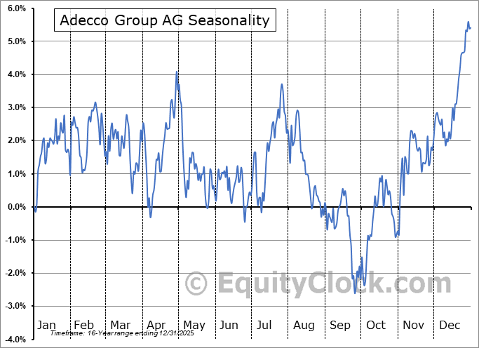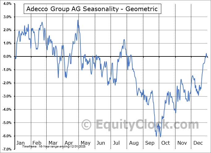 Analysis of the Adecco Group AG (OTCMKT:AHEXY) seasonal charts above shows that a Buy Date of November 22 and a Sell Date of February 26 has resulted in a geometric average return of 2.19% above the benchmark rate of the S&P 500 Total Return Index over the past 16 years. This seasonal timeframe has shown positive results compared to the benchmark in 12 of those periods. This is a good rate of success and the return strongly outperforms the relative buy-and-hold performance of the stock over the past 16 years by an average of 14.69% per year.