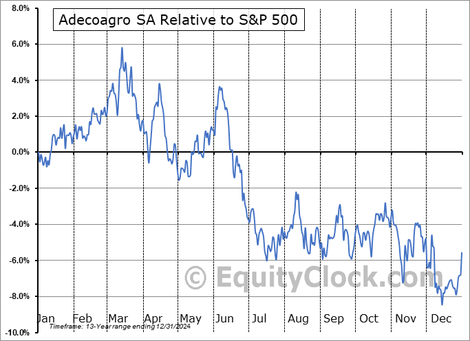 Analysis of the Adecoagro SA (NYSE:AGRO) seasonal charts above shows that a Buy Date of July 19 and a Sell Date of October 18 has resulted in a geometric average return of 2.29% above the benchmark rate of the S&P 500 Total Return Index over the past 13 years. This seasonal timeframe has shown positive results compared to the benchmark in 9 of those periods. This is a good rate of success and the return strongly outperforms the relative buy-and-hold performance of the stock over the past 13 years by an average of 13.31% per year.
