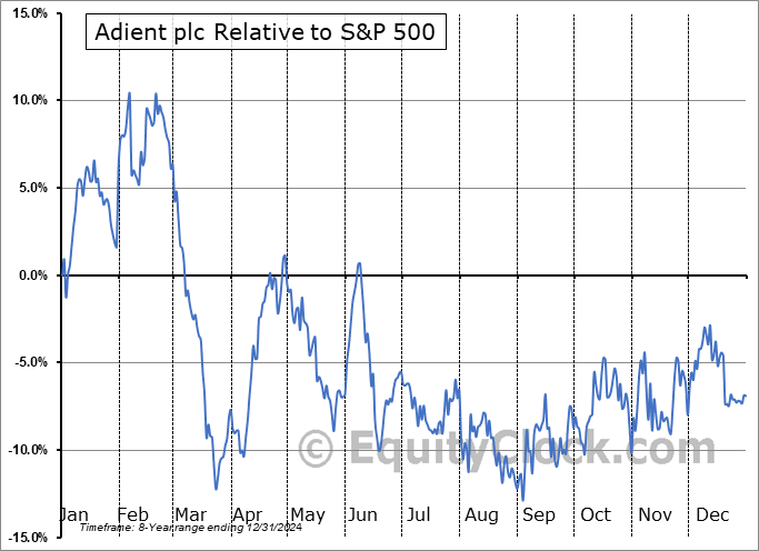 Analysis of the Adient plc (NYSE:ADNT) seasonal charts above shows that a Buy Date of November 9 and a Sell Date of February 6 has resulted in a geometric average return of 7% above the benchmark rate of the S&P 500 Total Return Index over the past 8 years. This seasonal timeframe has shown positive results compared to the benchmark in 7 of those periods. This is a very good rate of success and the return strongly outperforms the relative buy-and-hold performance of the stock over the past 8 years by an average of 31.65% per year.