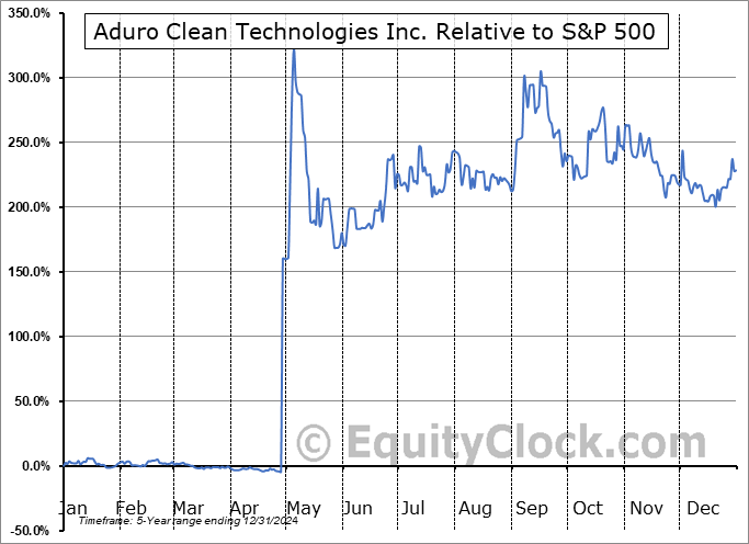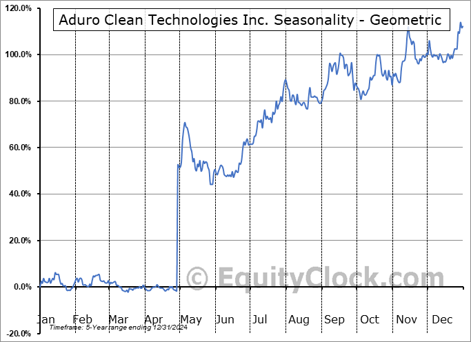 Analysis of the Aduro Clean Technologies Inc. (CSE:ACT.CA) seasonal charts above shows that a Buy Date of December 13 and a Sell Date of May 3 has resulted in a geometric average return of 69.3% above the benchmark rate of the S&P 500 Total Return Index over the past 5 years. This seasonal timeframe has shown positive results compared to the benchmark in 5 of those periods. This is an excellent rate of success, but the return underperforms the relative buy-and-hold performance of the stock over the past 5 years by an average of 16.1% per year.