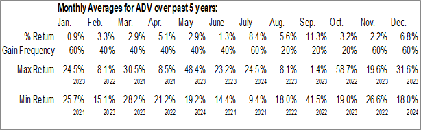 A word of caution: Only 5 years of data is available for shares of ADV, perhaps insufficient to create a seasonal profile that accurately gauges the seasonal tendencies influencing the investment. Ideally, while 20 years is preferred, at least 10 years of data is required to perform a seasonal analysis that is considered to be reliable for future seasonal periods.