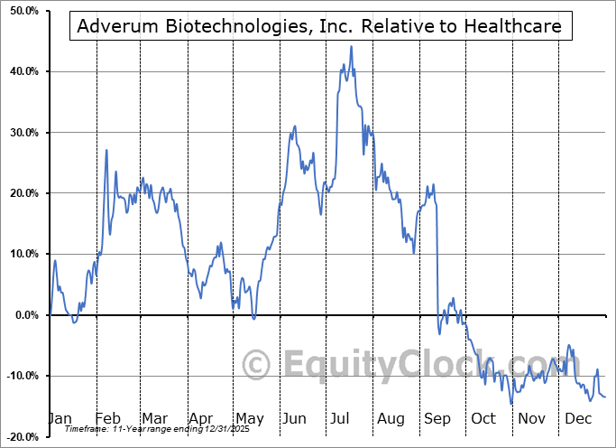 Analysis of the Adverum Biotechnologies, Inc. (NASD:ADVM) seasonal charts above shows that a Buy Date of December 5 and a Sell Date of March 19 has resulted in a geometric average return of 6.56% above the benchmark rate of the S&P 500 Total Return Index over the past 11 years. This seasonal timeframe has shown positive results compared to the benchmark in 7 of those periods. This is a fair rate of success and the return strongly outperforms the relative buy-and-hold performance of the stock over the past 11 years by an average of 49.99% per year.