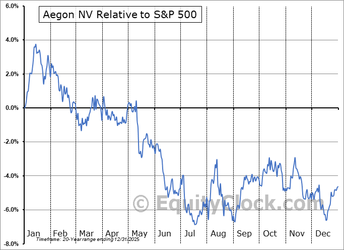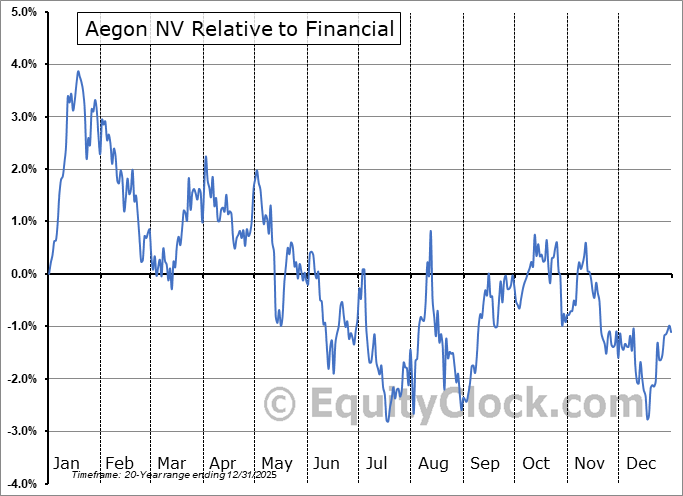 Analysis of the Aegon NV (NYSE:AEG) seasonal charts above shows that a Buy Date of August 29 and a Sell Date of January 21 has resulted in a geometric average return of 2.66% above the benchmark rate of the S&P 500 Total Return Index over the past 20 years. This seasonal timeframe has shown positive results compared to the benchmark in 14 of those periods. This is a good rate of success and the return strongly outperforms the relative buy-and-hold performance of the stock over the past 20 years by an average of 11.63% per year.
