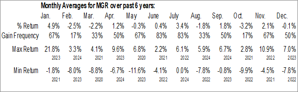 A word of caution: Only 6 years of data is available for shares of MGR, perhaps insufficient to create a seasonal profile that accurately gauges the seasonal tendencies influencing the investment. Ideally, while 20 years is preferred, at least 10 years of data is required to perform a seasonal analysis that is considered to be reliable for future seasonal periods.