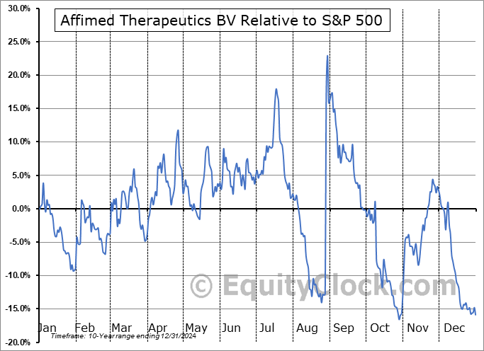 Analysis of the Affimed Therapeutics BV (NASD:AFMD) seasonal charts above shows that a Buy Date of February 23 and a Sell Date of May 21 has resulted in a geometric average return of 13.39% above the benchmark rate of the S&P 500 Total Return Index over the past 10 years. This seasonal timeframe has shown positive results compared to the benchmark in 7 of those periods. This is a good rate of success and the return strongly outperforms the relative buy-and-hold performance of the stock over the past 10 years by an average of 53.85% per year.