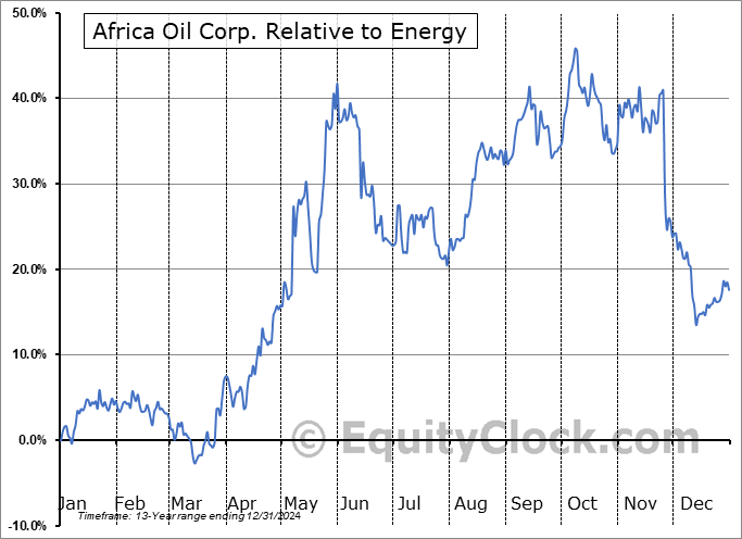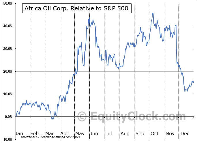 Analysis of the Africa Oil Corp. (OTCMKT:AOIFF) seasonal charts above shows that a Buy Date of March 18 and a Sell Date of June 8 has resulted in a geometric average return of 16.6% above the benchmark rate of the S&P 500 Total Return Index over the past 13 years. This seasonal timeframe has shown positive results compared to the benchmark in 10 of those periods. This is a good rate of success and the return strongly outperforms the relative buy-and-hold performance of the stock over the past 13 years by an average of 29.92% per year.