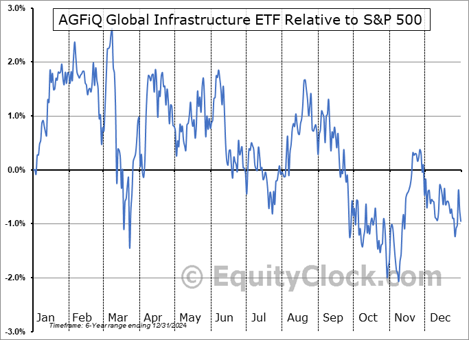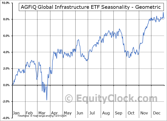 Analysis of the AGFiQ Global Infrastructure ETF (NEO:QIF.NE) seasonal charts above shows that a Buy Date of February 15 and a Sell Date of May 12 has resulted in a geometric average return of 3.55% above the benchmark rate of the S&P 500 Total Return Index over the past 6 years. This seasonal timeframe has shown positive results compared to the benchmark in 5 of those periods. This is a very good rate of success and the return strongly outperforms the relative buy-and-hold performance of the stock over the past 6 years by an average of 11.48% per year.