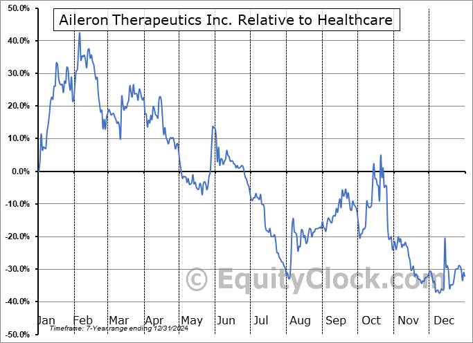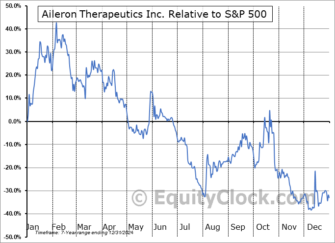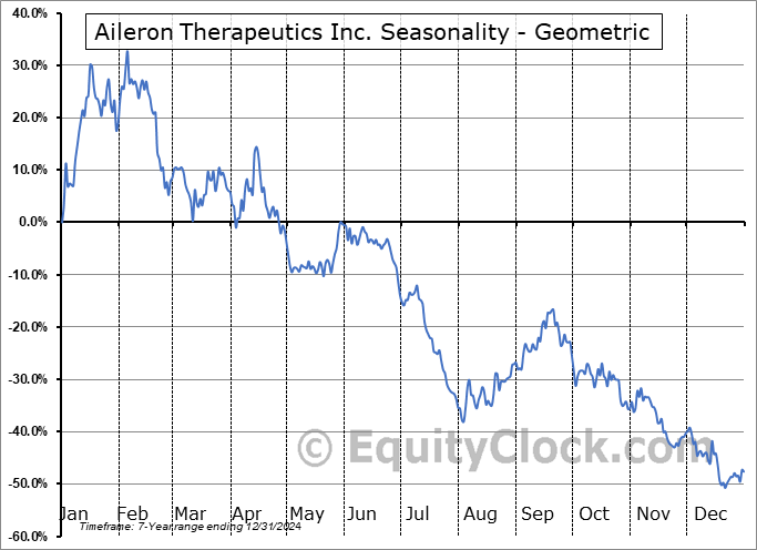 Analysis of the Aileron Therapeutics Inc. (NASD:ALRN) seasonal charts above shows that a Buy Date of December 29 and a Sell Date of April 15 has resulted in a geometric average return of 13.64% above the benchmark rate of the S&P 500 Total Return Index over the past 7 years. This seasonal timeframe has shown positive results compared to the benchmark in 5 of those periods. This is a good rate of success and the return strongly outperforms the relative buy-and-hold performance of the stock over the past 7 years by an average of 67.43% per year.