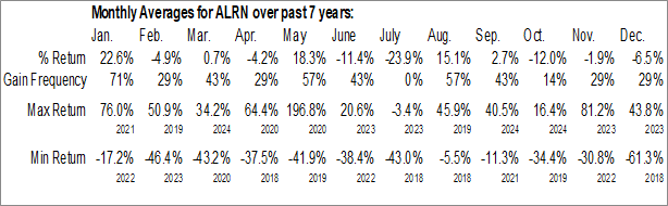 A word of caution: Only 7 years of data is available for shares of ALRN, perhaps insufficient to create a seasonal profile that accurately gauges the seasonal tendencies influencing the investment. Ideally, while 20 years is preferred, at least 10 years of data is required to perform a seasonal analysis that is considered to be reliable for future seasonal periods.