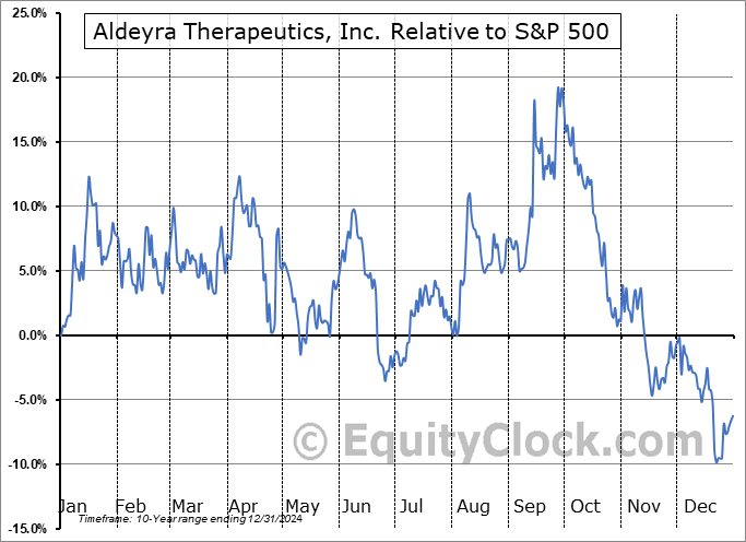 Analysis of the Aldeyra Therapeutics, Inc. (NASD:ALDX) seasonal charts above shows that a Buy Date of December 21 and a Sell Date of April 6 has resulted in a geometric average return of 6.52% above the benchmark rate of the S&P 500 Total Return Index over the past 10 years. This seasonal timeframe has shown positive results compared to the benchmark in 8 of those periods. This is a very good rate of success and the return strongly outperforms the relative buy-and-hold performance of the stock over the past 10 years by an average of 21.33% per year.