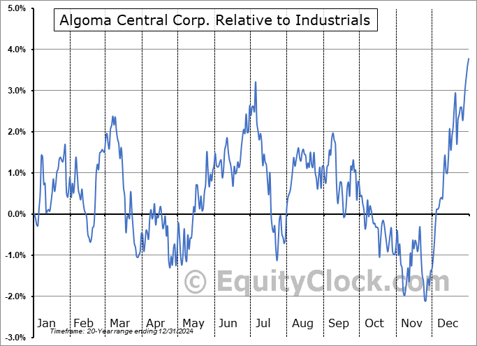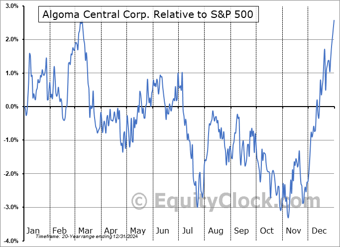 Analysis of the Algoma Central Corp. (TSE:ALC.TO) seasonal charts above shows that a Buy Date of November 25 and a Sell Date of March 7 has resulted in a geometric average return of 5.84% above the benchmark rate of the S&P 500 Total Return Index over the past 20 years. This seasonal timeframe has shown positive results compared to the benchmark in 15 of those periods. This is a good rate of success and the return strongly outperforms the relative buy-and-hold performance of the stock over the past 20 years by an average of 7.7% per year.