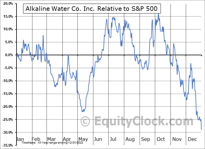 Analysis of the Alkaline Water Co. Inc. (NASD:WTER) seasonal charts above shows that a Buy Date of May 13 and a Sell Date of August 1 has resulted in a geometric average return of 27.91% above the benchmark rate of the S&P 500 Total Return Index over the past 10 years. This seasonal timeframe has shown positive results compared to the benchmark in 9 of those periods. This is an excellent rate of success and the return strongly outperforms the relative buy-and-hold performance of the stock over the past 10 years by an average of 81.15% per year.